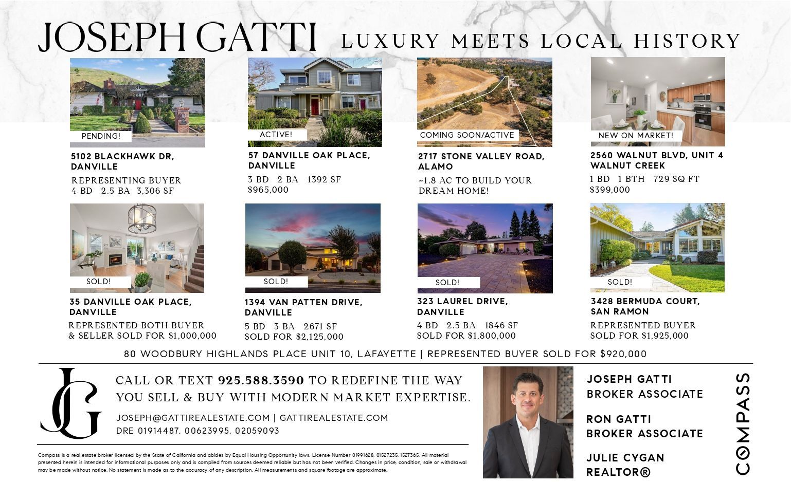With 14 years of experience serving the Greater Danville area, I bring deep market knowledge and a personalized, strategic approach to every client relationship. As an Associate Broker with Compass, I combine national resources with local expertise to deliver results. I’ve also had the privilege of working alongside my father, Ron Gatti, whose 48 years in local real estate built a strong foundation in this community.